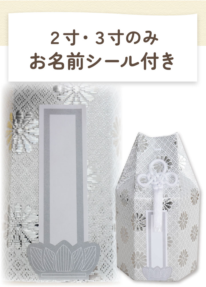 | 注意事項 | ・戒名シール付き:2寸、2.3寸 3寸 ・戒名シール無し:3.5寸、4寸、5寸、6寸、7寸 |