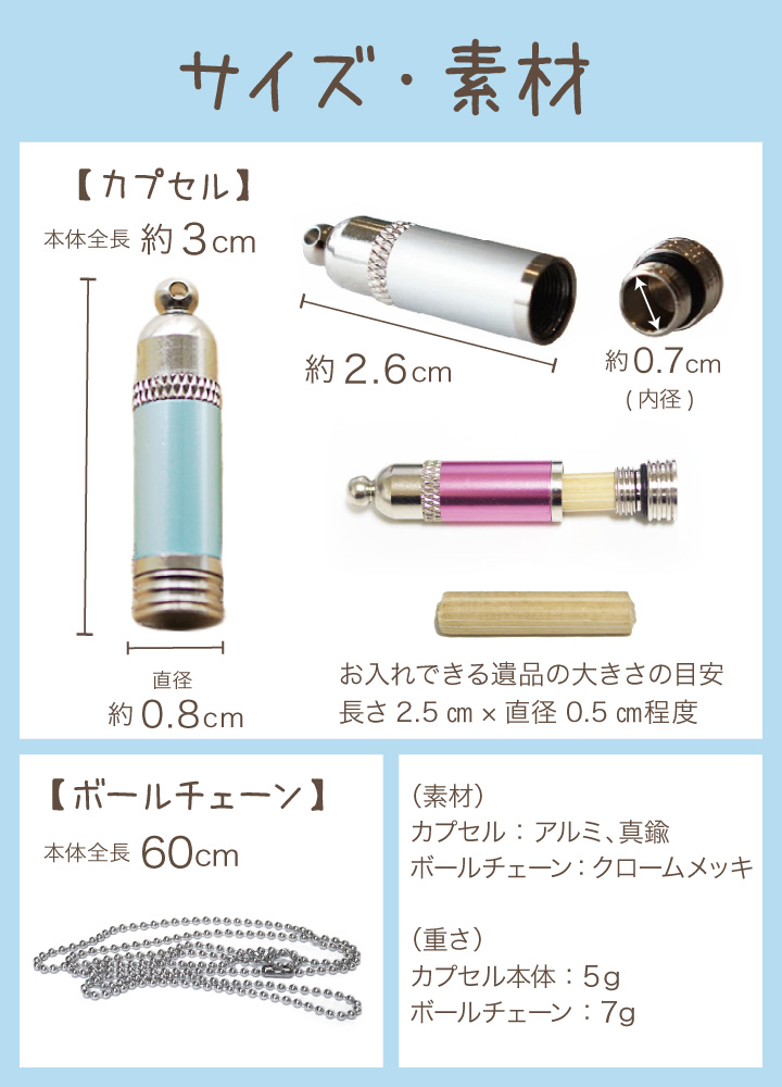| サイズ | カプセル:直径0.8cm/長さ3cm(重さ:5g) ボールチェーン:長さ60cm(重さ:7g) |