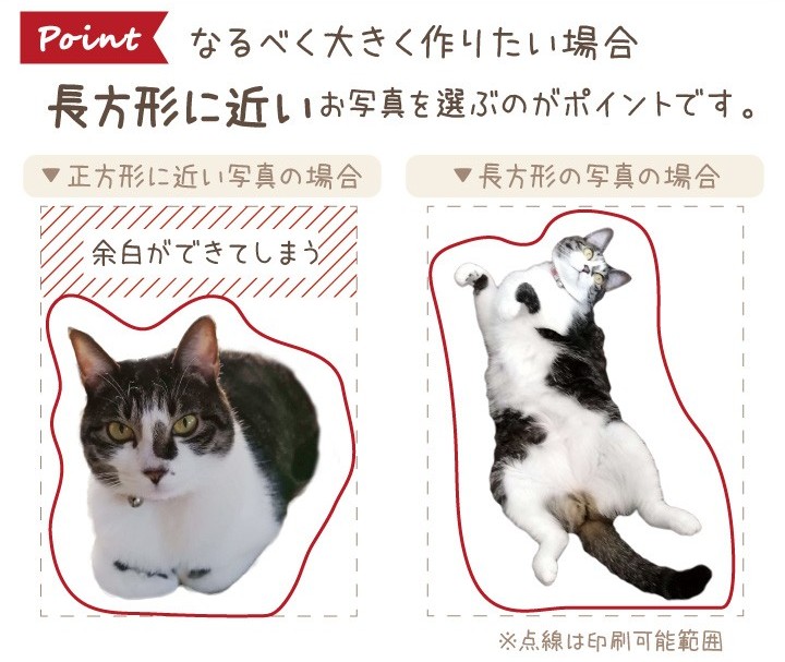 | サイズ | お作りする写真に応じて、サイズ・形が異なります。 平置きした時に長辺(最大幅)が28cm(A4)になる布地に印刷をし、製作します。 ※ぬいしろが必要となるため、仕上がりサイズは28cmにはなりません。 ![]() |