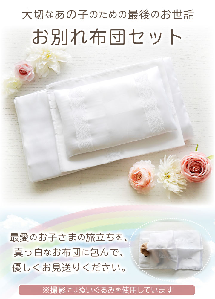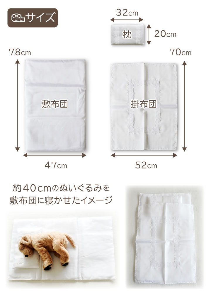 | サイズ | ・敷布団(約47cm×78cm) ・掛布団(約52cm×70cm) ・枕(約20cm×32cm) ※3点セットです。バスケットや棺はセットではございません。  |