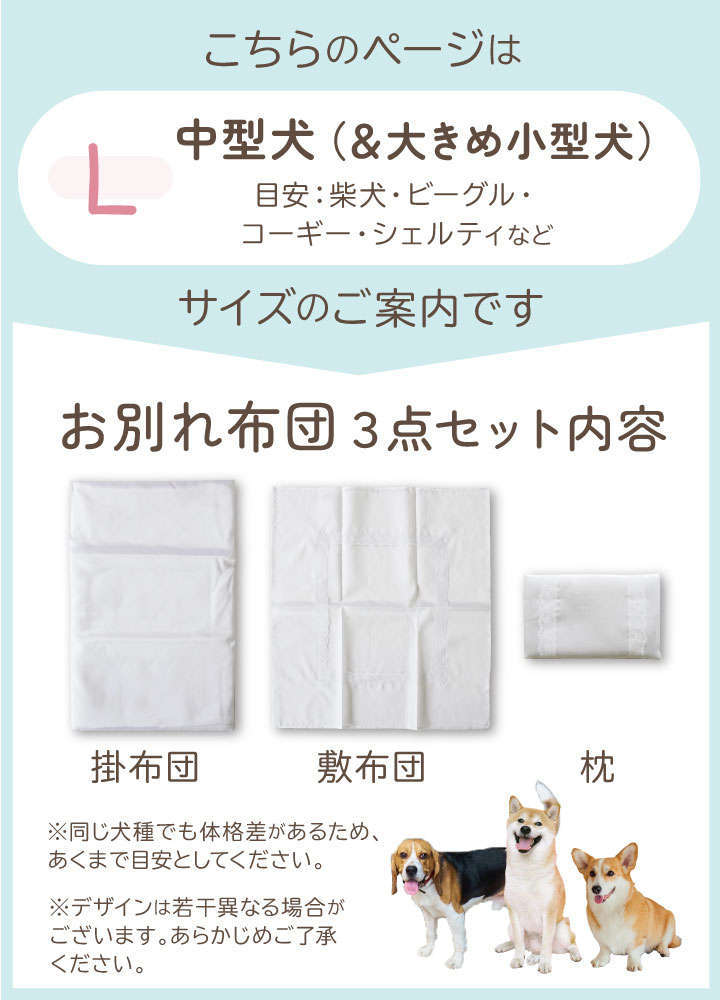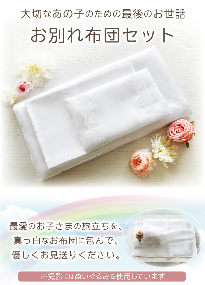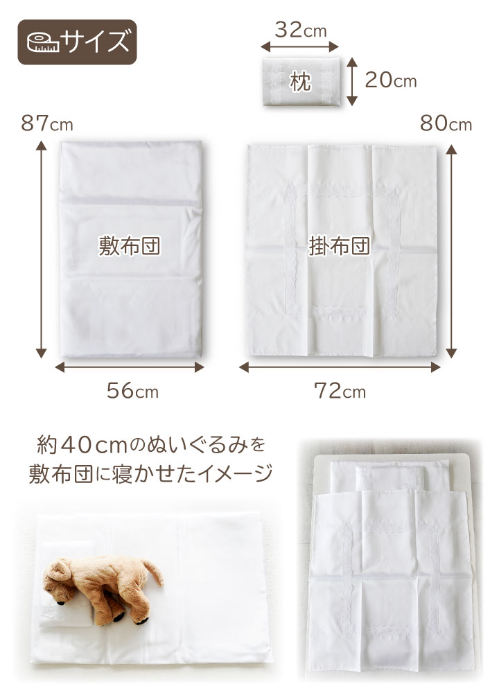 | サイズ | ・敷布団(約56cm×87cm) ・掛布団(約72cm×80cm) ・枕(約20cm×32cm) ※3点セットです。バスケットや棺はセットではございません。 |